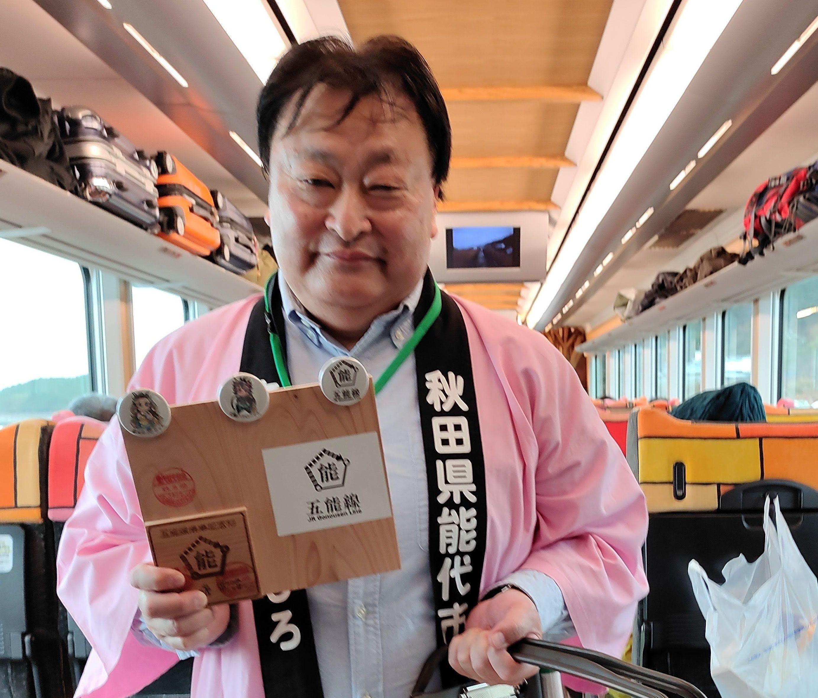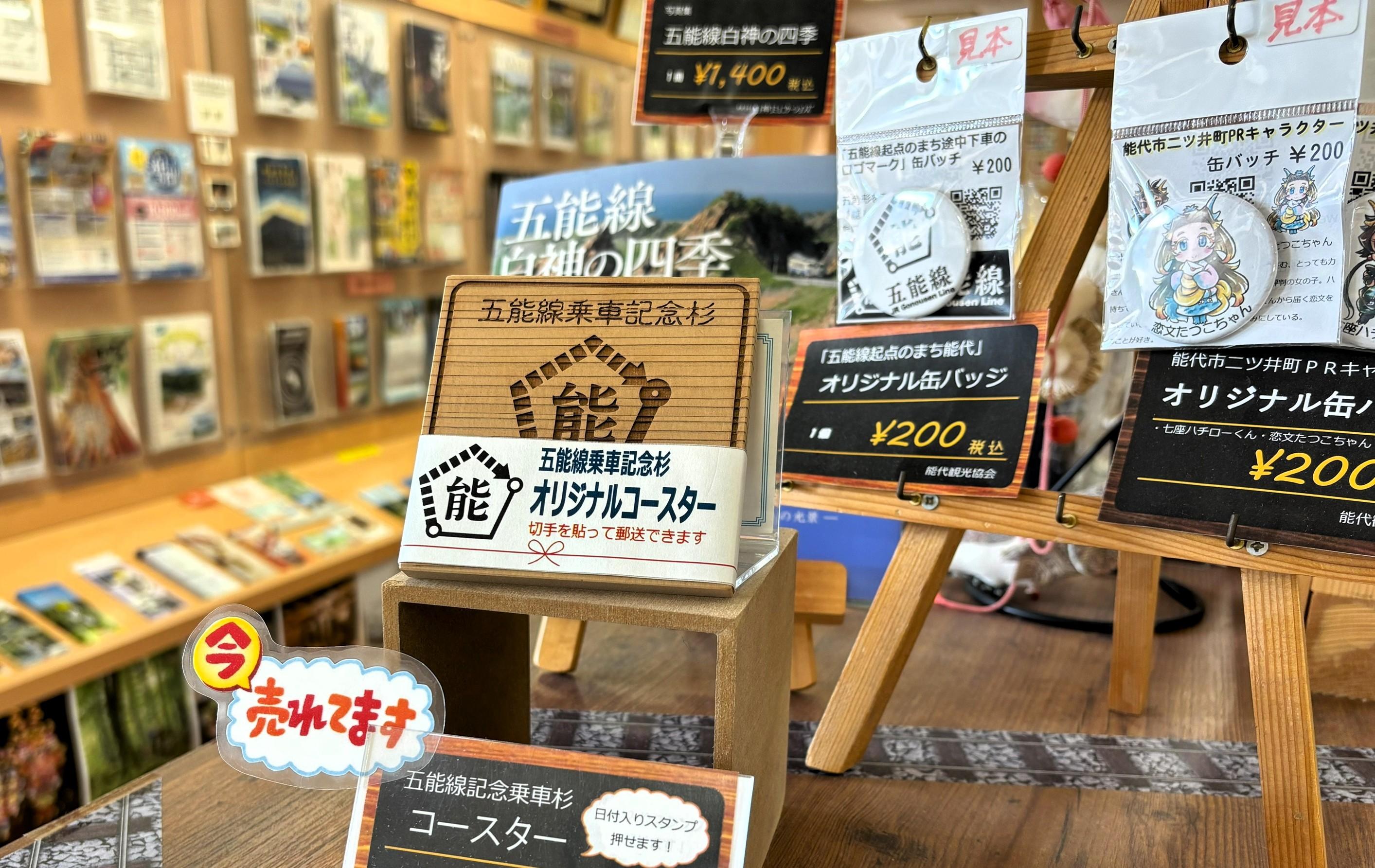 秋田杉にレーザー彫刻した人気の「五能線乗車記念杉コースター」は、冬期を除く期間「リゾートしらかみ」のふれあい販売や、能代観光協会(能代駅構内)で販売しています。ご希望により日付入りの特製スタンプを押印できます。私(斉藤常治)も、かつて車内販売をお手伝いしたことがあります。