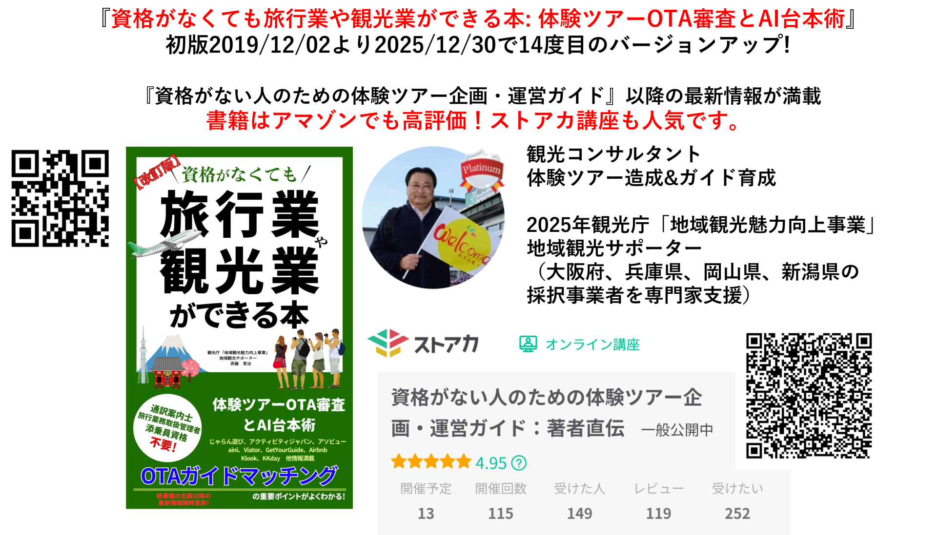 2024年8月発刊『資格がない人のための体験ツアー企画・運営ガイド』(https://www.amazon.co.jp/dp/479807313X/ )以降の最新情報を反映したキンドル本を大幅バージョンアップしました!